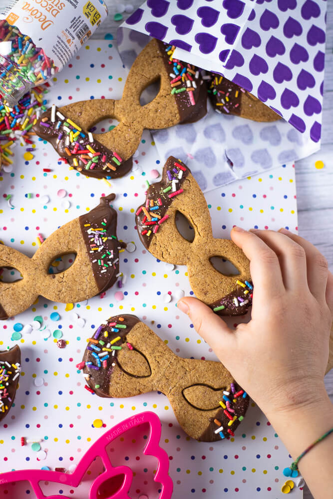 Folge mir und schau dir auf meinem Instagram-Kanal ein kurzes Zubereitungsvideo dieser Karnevalskekse an, in dem ich zeige, wie du die Kekse backen kannst und wie dein Kind dich beim Ausstechen und Verzieren unterstützen kann.