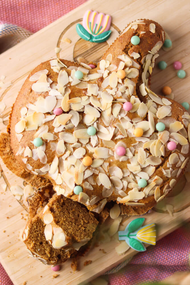 Fülle den Teig in eine Colomba-Backform und streue die gehobelten Mandeln gleichmäßig obenauf. Backe die Colomba bei 180°C (Ober-/Unterhitze) für etwa 40-45 Minuten. Wenn die Oberfläche goldbraun ist, prüfe mit einem Holzstäbchen, ob der Teig durchgebacken ist.