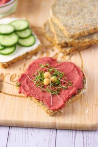 Einfach gekochte Rote Bete mit Kichererbsen, Salz, Zitronensaft, Olivenöl und Pfeffer pürieren. Cremig, farbenfroh und super gesund!