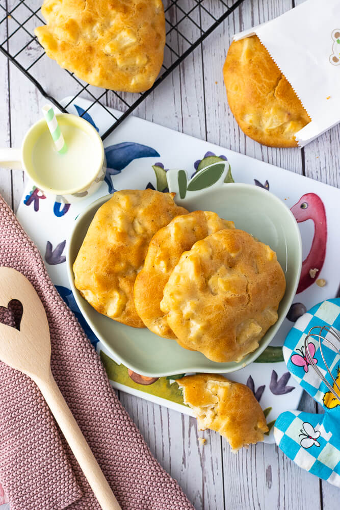 Diese Joghurt-Apfel-Taler sind ohne Zucker gebacken – die natürliche Süße kommt ausschließlich von den Äpfeln. Ich bevorzuge zum Backen süße Apfelsorten wie Pink Lady, Golden Delicious oder Jonagold. Seit Jahren nehme ich mir vor, Äpfel selbst zu pflücken – vielleicht schon vor meiner Schwangerschaft! In unserer Nähe gibt es einige Bauernhöfe, die Apfelpflücken anbieten. Hast du das schon mal gemacht? Ich würde mich freuen, in den Kommentaren von deinen Erfahrungen zu lesen!