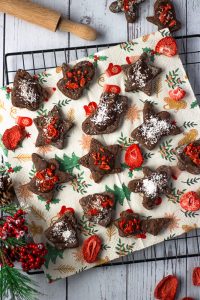 Wir haben die Schoko-Plätzchen letztes Jahr am 1. Adventssonntag gebacken. Sophia, meine kleine Backhelferin, hatte besonders viel Spaß beim Ausrollen und Dekorieren. Als Topping haben ich die Plätzchen mit Dattelschokolade, Kokosflocken und getrocknete Erdbeeren verfeinert. Du kannst du natürlich deine Plätzchen nach deinem Geschmack anpassen. Ich fande die Idee mit den Topping richtig schön und natürlich sehr lecker.