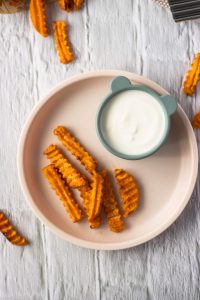 Babys können die Süßkartoffelpommes mit der ganzen Familie genießen, wenn sie beikostreif sind (6/7 Monat). Sie eignen sich hervorragend als Starter-Lebensmittel für die breifreie Beikost und die Breibeikost. Du schneidest die Süßkartoffeln in längliche Streifen, sodass dein Baby sie gut greifen kann. Ich schneide selbst gemachte Pommes gerne mit einem Riffelmesser, dann haben die Pommes einen schönen Wellenmuster. Die Babyfingerchen passen sich super an das Lebensmittel an, da sie Wellenmuster haben.
