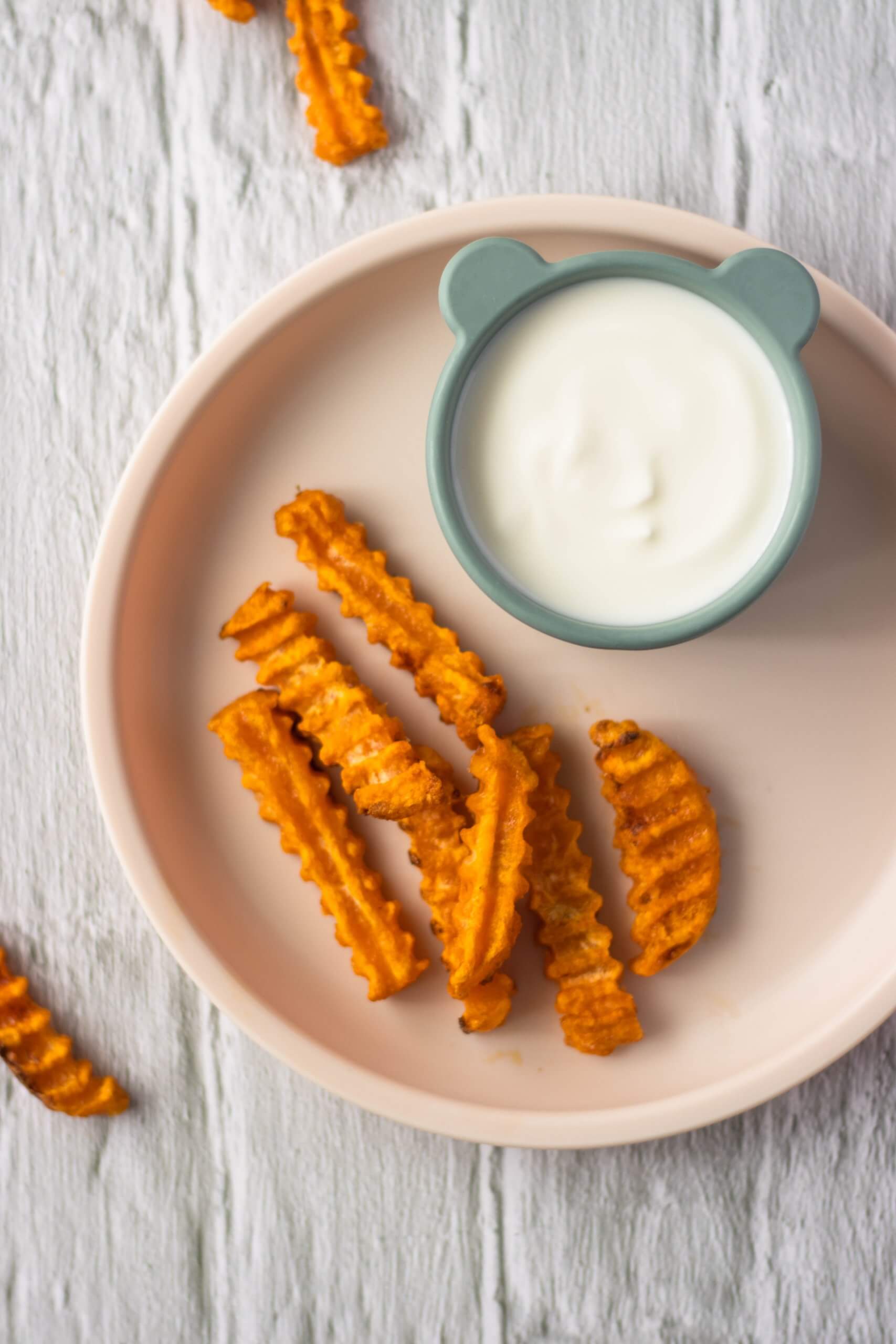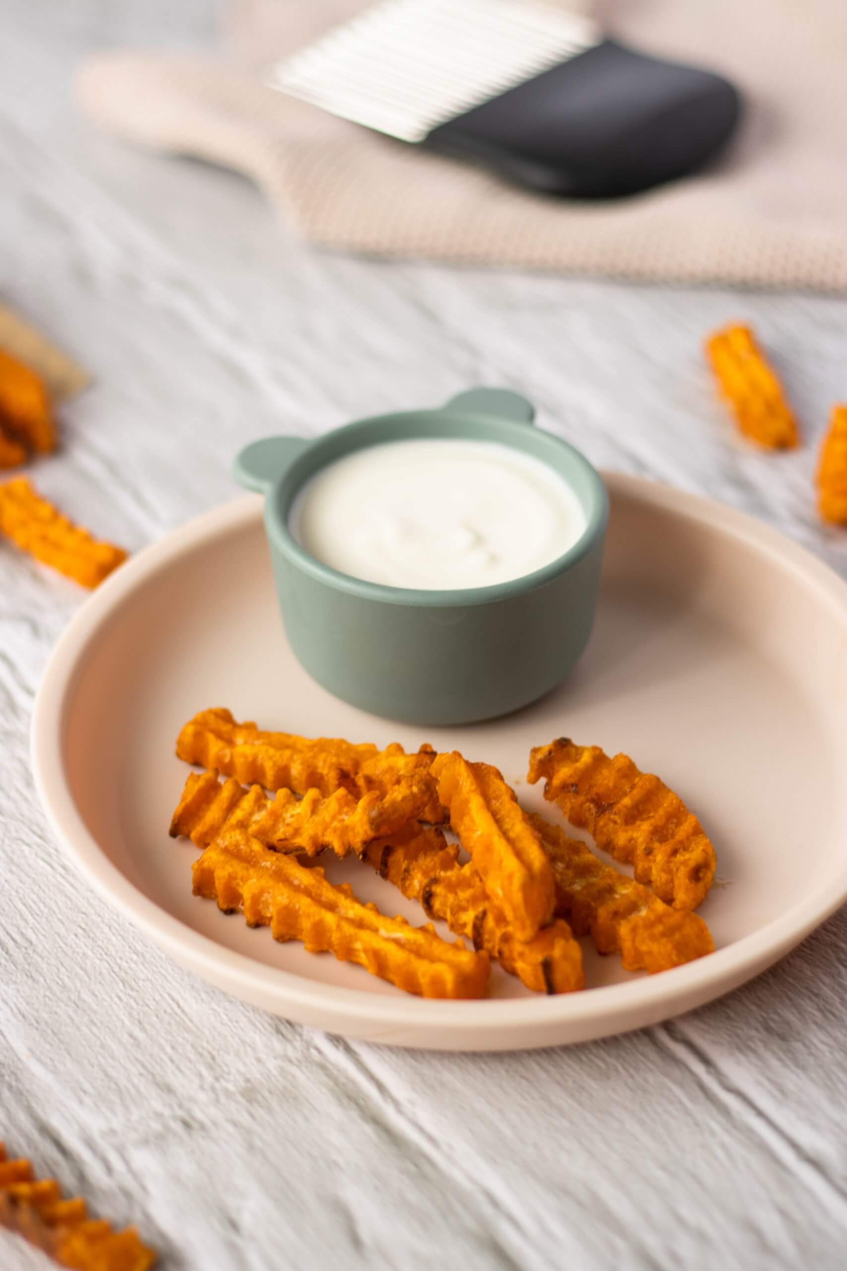 Heute gibt es ein gesundes und leckeres Rezept. Es sind köstliche Süßkartoffelpommes für breifrei Babys und Familie. Wir lieben einfach Ofengerichte, insbesondere selbst gemachte knusprige Kartoffelspalten. Wenn ich Süßkartoffelpommes mache, denke ich oft: Warum backe ich sie nicht öfter? Sie schmecken so gut. Ich habe die Süßkartoffelpommes mit Olivenöl, Paprika und Meersalz gewürzt. Für Babys ohne Salz würzen. Natürlich kannst du sie mit verschiedenen Kräutern zubereiten, zum Beispiel mit italienische Kräuter, Rosmarin oder Basilikum. Als Dip essen wir am liebsten Naturjoghurt, aber auch Humus oder Guacamole passen gut dazu.