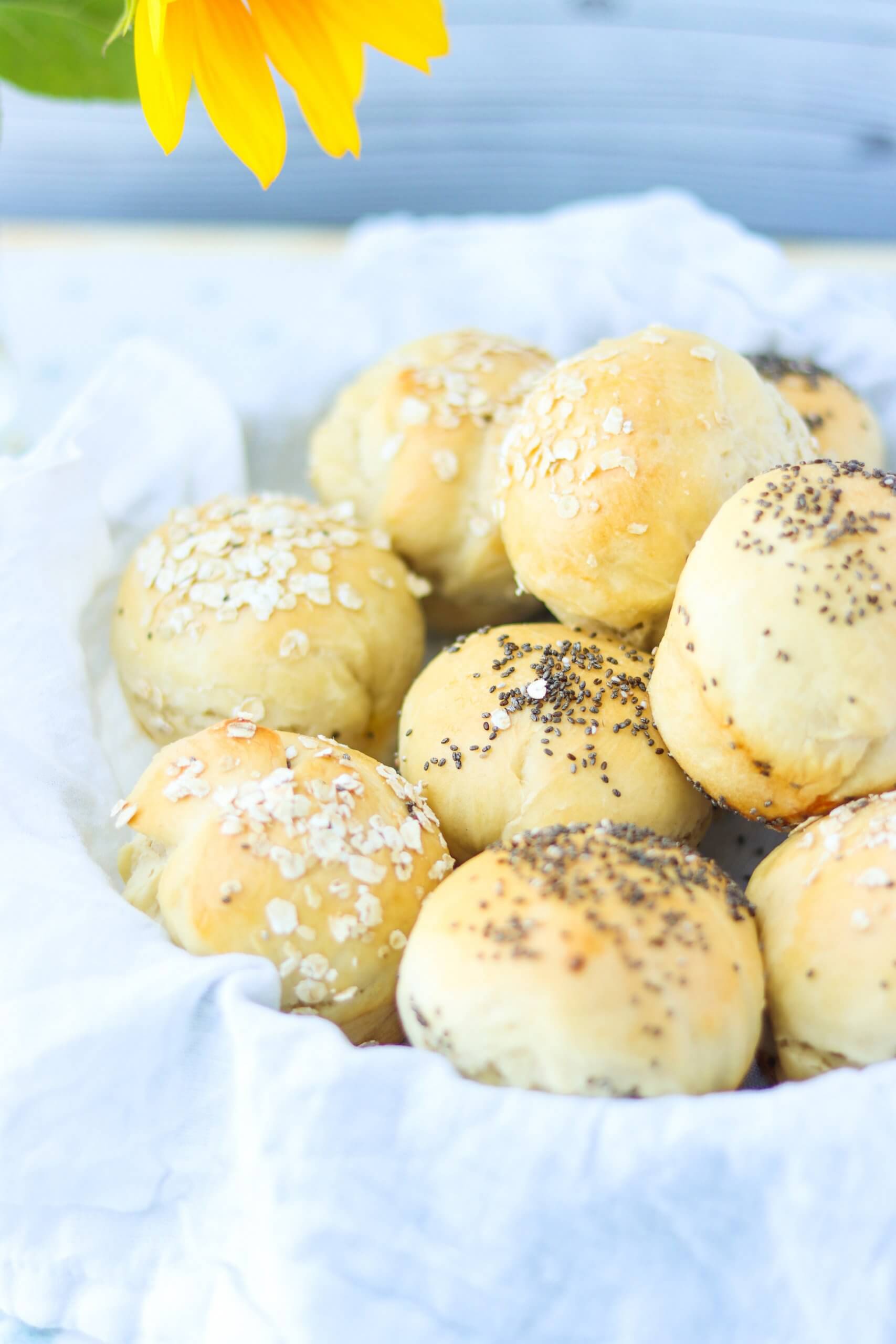 Heize den Backofen auf 180 °C Ober-/Unterhitze vor. Lass die Brötchen noch einmal kurz ruhen ( 10 -15 Min). Backe nun die Mini-Brötchen für etwa 20 Minuten, bis sie schön goldgelb sind.