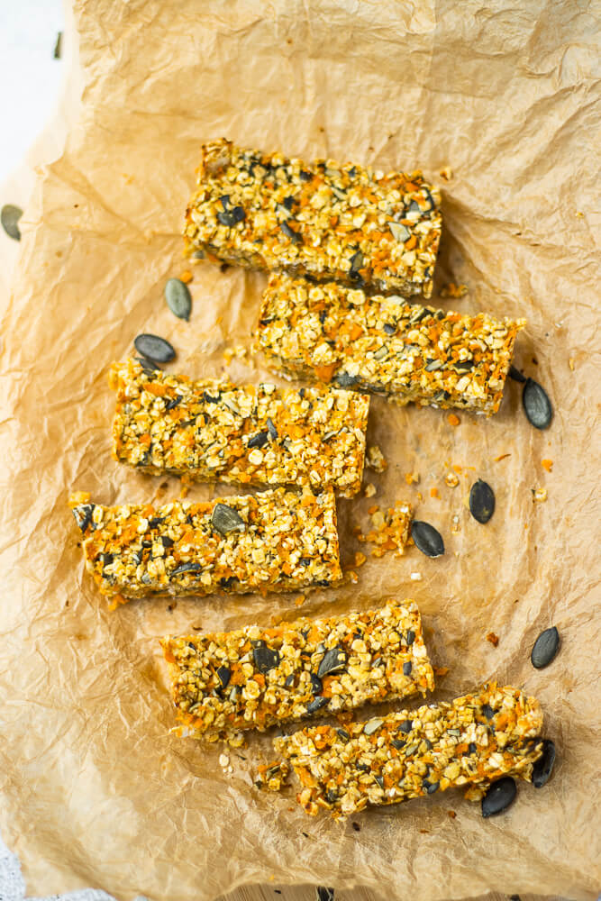 Die geraspelte Möhre, gehackten Kürbiskerne, Haferflocken, Ei und Parmesan in einer Schüssel gut vermengen.