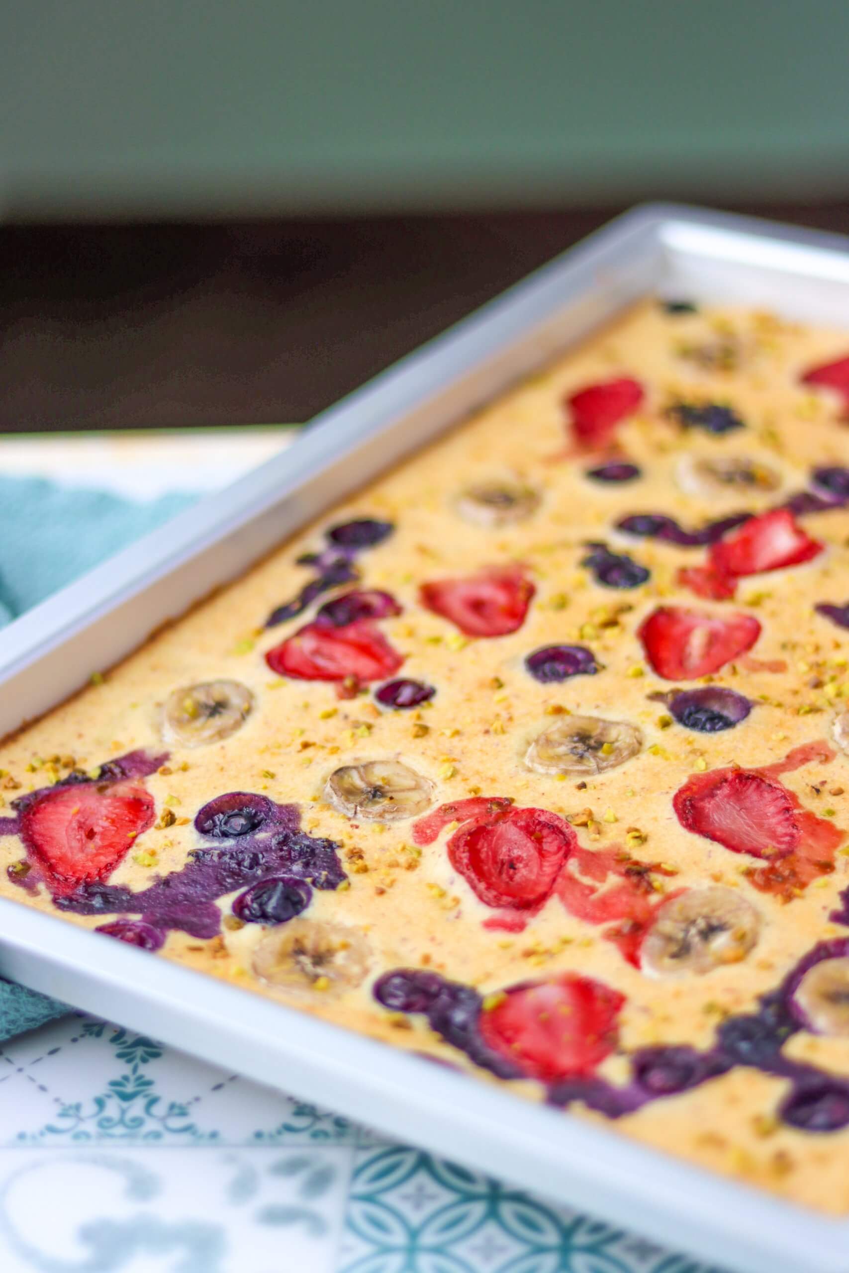 Nach Belieben toppen: z. B. mit Beeren, Bananenscheiben, Flocken oder Schokotropfen. Für ca. 20–25 Minuten im Ofen backen, bis der Pfannkuchen goldbraun ist.